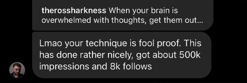 Here's an example from Ross after I shared my Instagram strategy with him.Please keep in mind that he had a foundation of quality content, consistency, and a previous Twitter audience. These are abnormal, but possible, results: