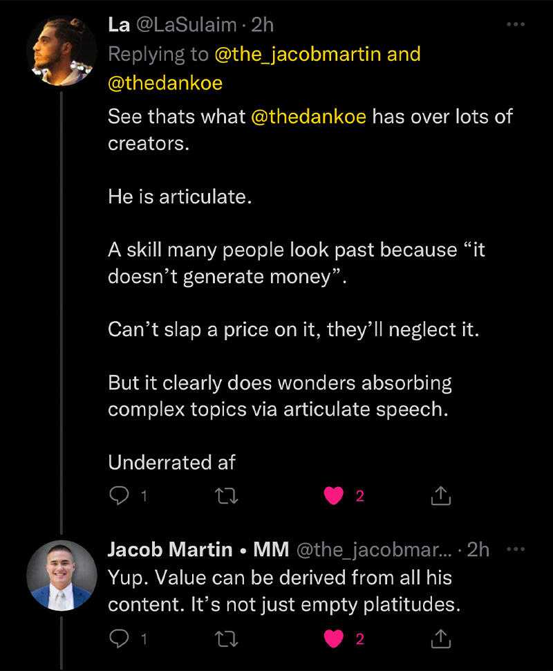 There is one thing that separates those who make it in the digital economy and those who don't.It's the quality, articulation, and perceived originality of their content.The content you post has to make sense to the people you attract.Everyone has a different voice and tone that they resonate with. That they are congruent with and trust.It has to change their thought patterns or behavior — that's what makes you memorable.That's what separates you from the sea of people posting surface-level copy-cat style posts.Example and putting my money where my mouth is: